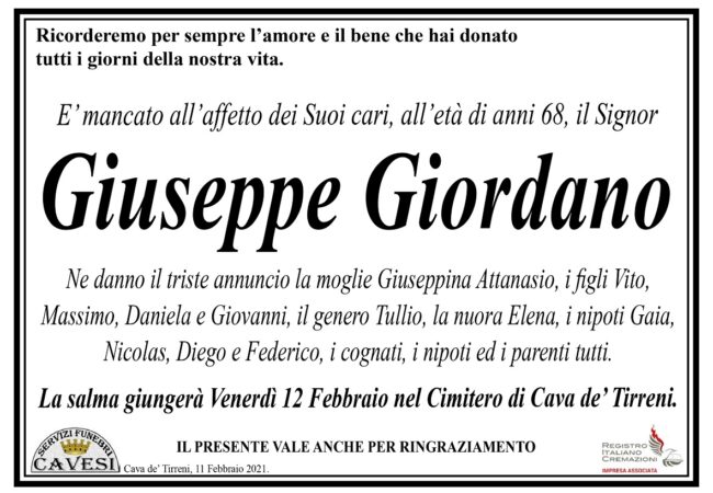 E’ mancato all’affetto dei Suoi cari, all’età di anni 68, il Signor Giuseppe Giordano.