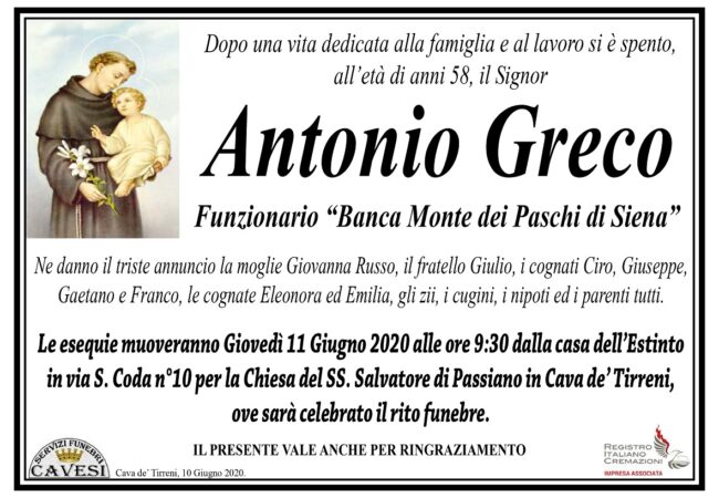 Dopo una vita dedicata alla famiglia e al lavoro si è spento, all’età di 58 anni, il Signor Antonio Greco, Funzionario “Banca Monte dei Paschi di Siena”.