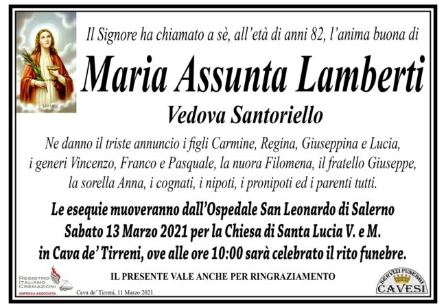 Il Signore ha chiamato a sè, all’età di anni 82, l’anima buona di Maria Assunta Lamberti, vedova Santoriello.