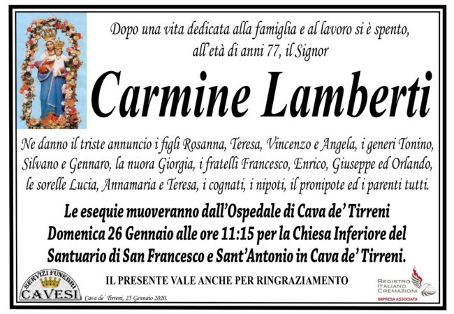 Le esequie muoveranno dall’Ospedale di Cava de’ Tirreni domani, domenica 26 gennaio, alle ore 11,15, per la Chiesa Inferiore del Santuario di San Francesco e Sant’Antonio in Cava de’ Tirreni.