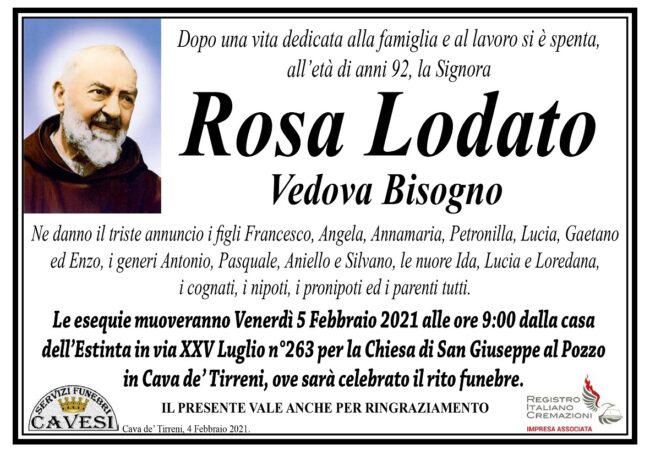 Le esequie muoveranno domani, venerdì 5 febbraio, alle ore 9, dalla casa dell’Estinta in via XXV Luglio, n. 263, per la Chiesa di San Giuseppe al Pozzo in Cava de’ Tirreni, ove sarà celebrato il rito funebre.