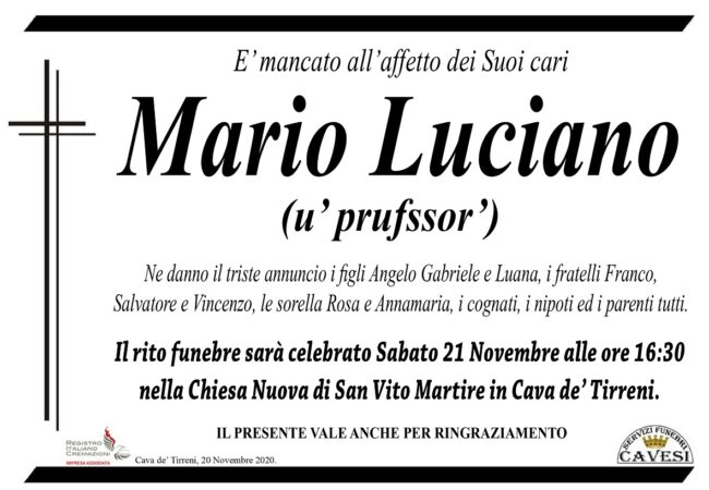 Il rito funebre sarà celebrato oggi pomeriggio, sabato 21 novembre, alle ore 16,30, nella Chiesa Nuova di San Vito Martire in Cava de’ Tirreni.