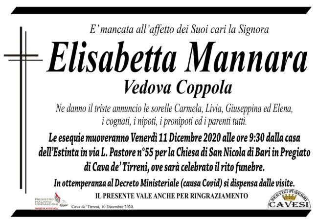 Le esequie muoveranno domani, venerdì 11 dicembre, alle ore 9,30, dalla casa dell’Estinta in via L. Pastore n. 55 per la Chiesa di San Nicola di Bari in Pregiato di Cava de’ Tirreni, ove sarà celebrato il rito funebre.