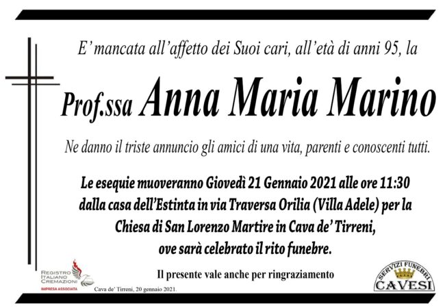 Le esequie muoveranno stamani, giovedì 21 gennaio, alle ore 11:30, dalla casa dell’Estinta in via Traversa Orilia (Villa Adele) per la Chiesa di San Lorenzo Martire in Cava de’ Tirreni, dove sarà celebrato il rito funebre.