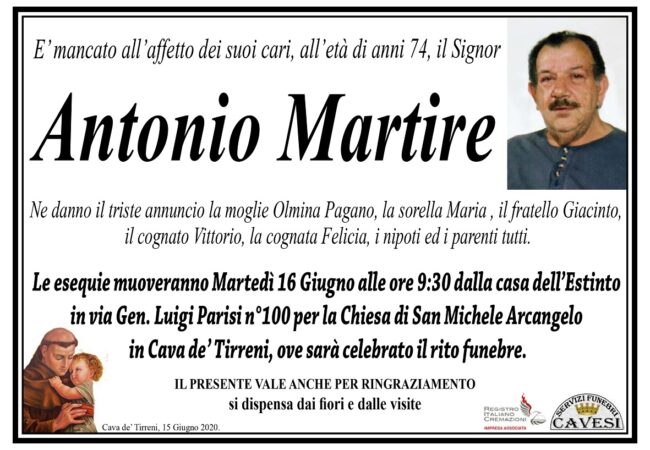 E’ mancato all’affetto dei suoi cari, all’età di anni 74 anni, il Signor Antonio Martire.