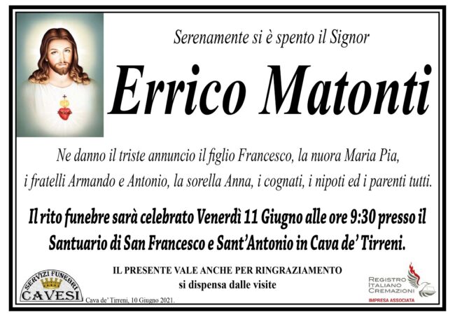 Il rito funebre sarà celebrato domani, venerdì 11 giugno, alle ore 9,30, presso il Santuario di San Francesco e Sant’Antonio in Cava de’ Tirreni.