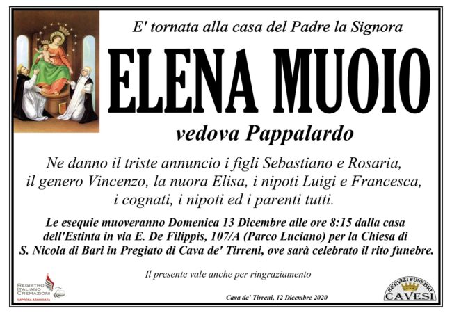 Le esequie muoveranno stamani domenica 13 dicembre alle ore 8,15 dalla casa dell’Estinta in via E. De Filippis, 107/A (Parco Luciano) per la Chiesa di S. Nicola di Bari in Pregiato di Cava de’ Tirreni, ove sarà celebrato il rito funebre.