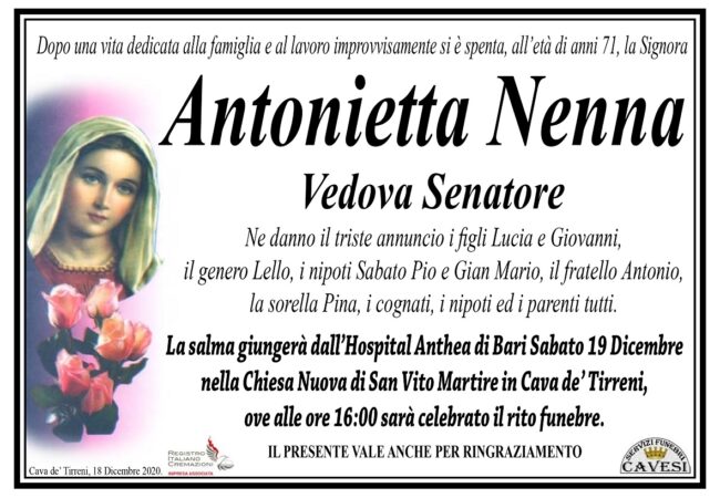 La salma giungerà dall’Hospital Anthea di Bari oggi, sabato 19 dicembre, nella Chiesa Nuova di San Vito Martire in Cava de’ Tirreni, dove alle ore 16 sarà celebrato il rito funebre.