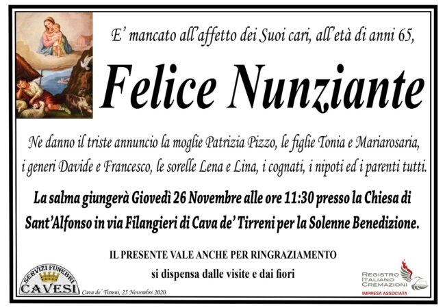 E’ mancato all’affetto dei Suoi cari, all’età di anni 65, Felice Nunziante.
