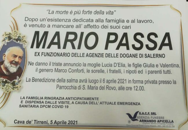 Alla famiglia Passa e in particolare al fratello Enzo, consigliere al Comune di Cava de’ Tirreni, giunga il profondo cordoglio del Direttore e della Redazione di Ulisse on line.