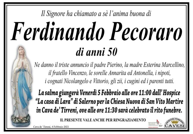 Il Signore ha chiamato a sè l’anima buona di Ferdinando Pecoraro, di anni 50.