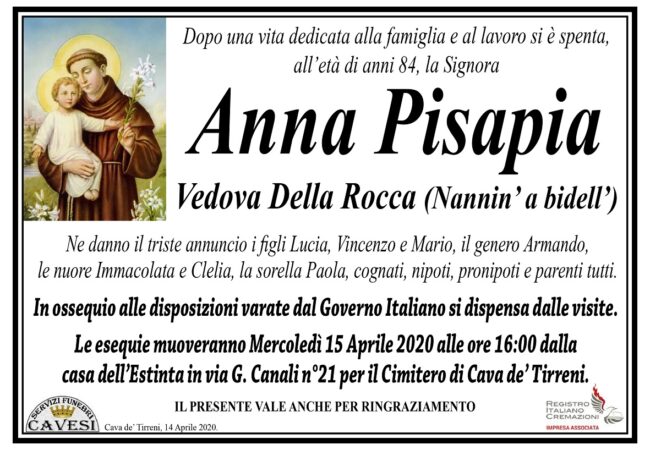 Le esequie muoveranno oggi pomeriggio, mercoledì 15 aprile, alle ore 16, dalla casa dell’Estinta in via G. Canali n. 21 per il Cimitero di Cava de’ Tirreni.