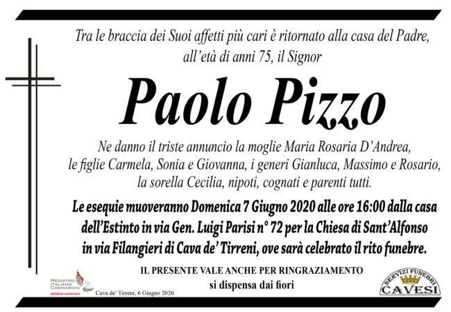 Tra le braccia dei Suoi affetti più cari è ritornato alla casa del Padre, all’età di 75 anni, il signor Paolo Pizzo.