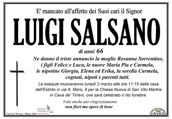 E’ mancato all’affetto dei Suoi cari, all’età di 66 anni, il Signor Luigi Salsano.
