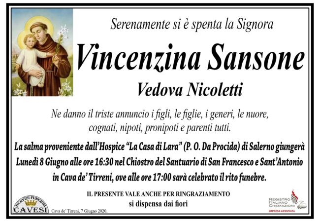 La salma proveniente dall’Hospice “La Casa di Lara” (P. O. Da Procida) di Salerno giungerà oggi pomeriggio, lunedì 8 giugno, alle ore 16,30, nel Chiostro del Santuario di San Francesco e Sant’Antonio in Cava de’ Tirreni, dove alle ore 17 sarà celebrato il rito funebre.