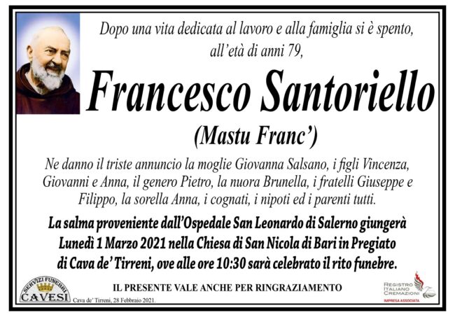 La salma proveniente dall’Ospedale San Leonardo di Salerno giungerà questa mattina, lunedì 1° marzo, nella Chiesa di San Nicola di Bari in Pregiato di Cava de’ Tirreni, ove alle ore 10:30 sarà celebrato il rito funebre.