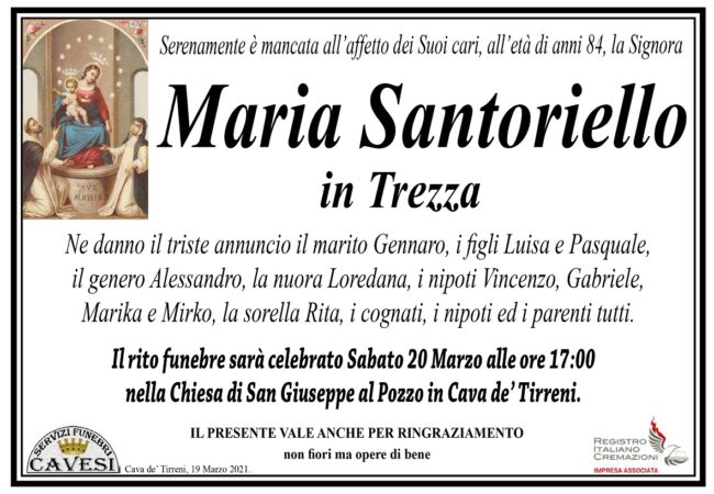 Serenamente è mancata all’affetto dei Suoi cari, all’età di anni 84, la Signora Maria Santoriello in Trezza.