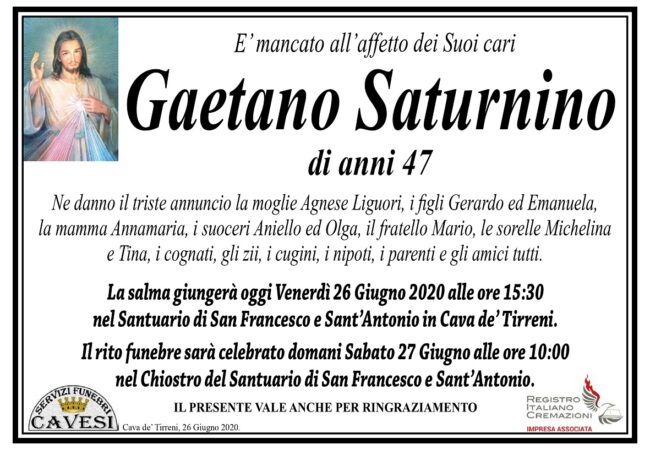 E’ mancato all’affetto dei Suoi cari, all’età di 47 anni, Gaetano Saturnino.