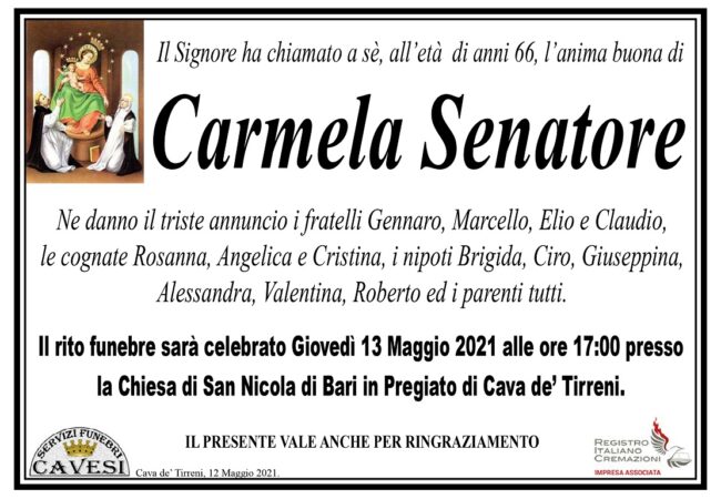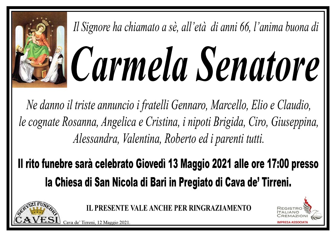 Il Signore ha chiamato a sé, all’età di anni 66, l’anima buona di Carmela Senatore.