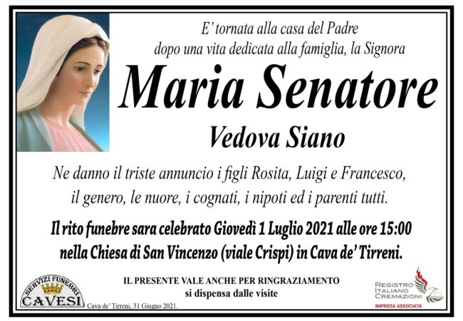 Il rito funebre sarà celebrato oggi pomeriggio, giovedì 1° luglio, alle ore 15, nella Chiesa di San Vincenzo (viale Crispi) in Cava de’ Tirreni.
