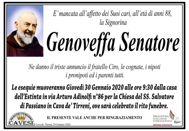 Le esequie muoveranno domani, giovedì 30 gennaio, alle ore 9,30, dalla casa dell’Estinta in via Arturo Adinolfi, n. 86, per la Chiesa del SS. Salvatore di Passiano in Cava de’ Tirreni, dove sarà celebrato il rito funebre.