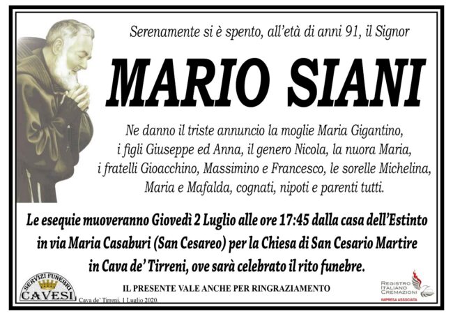 Le esequie muoveranno oggi pomeriggio, giovedì 2 luglio, alle ore 17,45, dalla casa dell’Estinto in via Maria Casaburi (San Cesareo), per la Chiesa di San Cesario Martire in Cava de’ Tirreni, dove sarà celebrato il rito funebre.