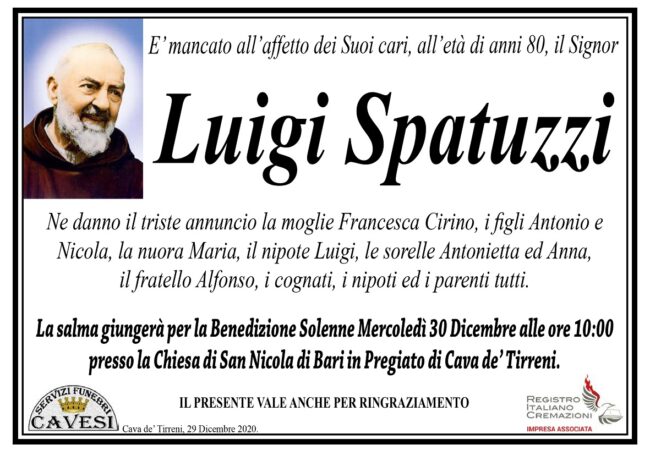 E’ mancato all’affetto dei Suoi cari, all’età di anni 80, il Signor Luigi Spatuzzi.