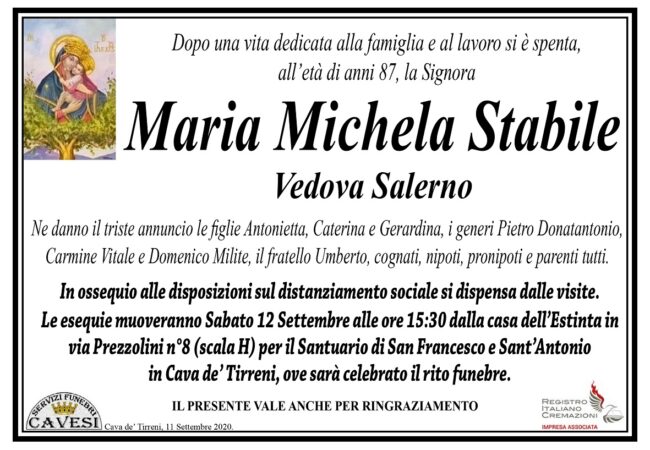 Dopo una vita dedicata alla famiglia e al lavoro si è spenta, all’età di 87 anni, la Signora Maria Michela Stabile vedova Salerno.