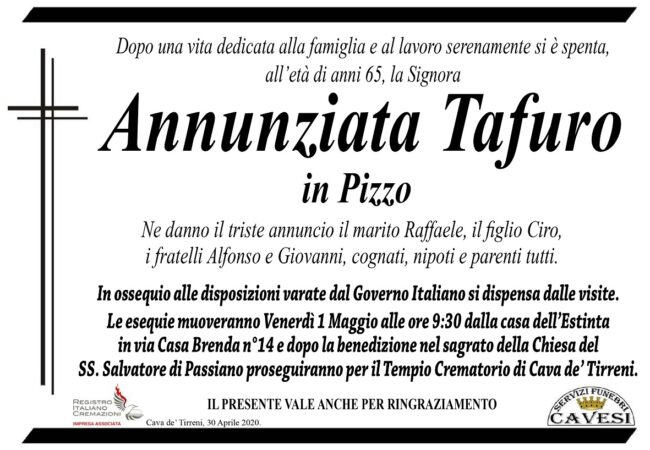 Le esequie muoveranno domani, venerdì 1 maggio, alle ore 9,30, dalla casa dell’Estinta in via Casa Brenda, n. 14, e dopo la benedizione nel sagrato della Chiesa del SS. Salvatore di Passiano proseguiranno per il Tempio Crematorio di Cava de’ Tirreni.