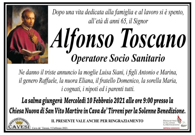 Dopo una vita dedicata alla famiglia e al lavoro si è spento, all’età di anni 65, il Signor Alfonso Toscano, Operatore Socio Sanitario.