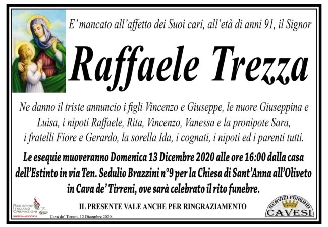 E’ mancato all’affetto dei Suoi cari, all’età di anni 91, il Signor Raffaele Trezza.