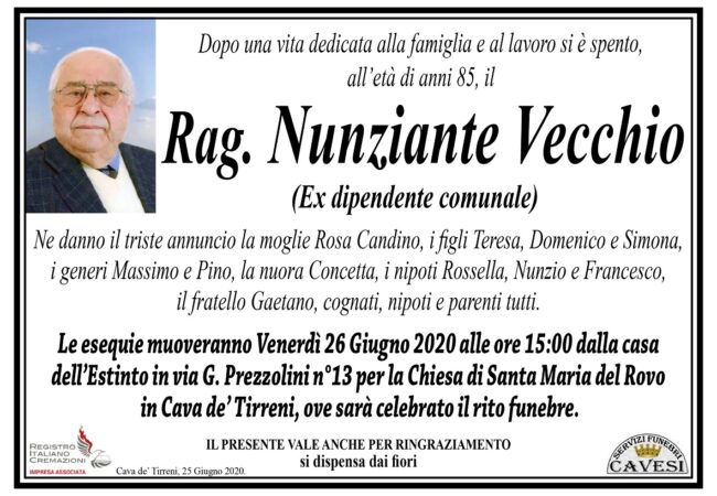 Le esequie muoveranno domani, venerdì 26 giugno, alle ore 15, dalla casa dell’Estinto in via G. Prezzolini, n. 13, per la Chiesa di Santa Maria del Rovo in Cava de’ Tirreni, dove sarà celebrato il rito funebre.