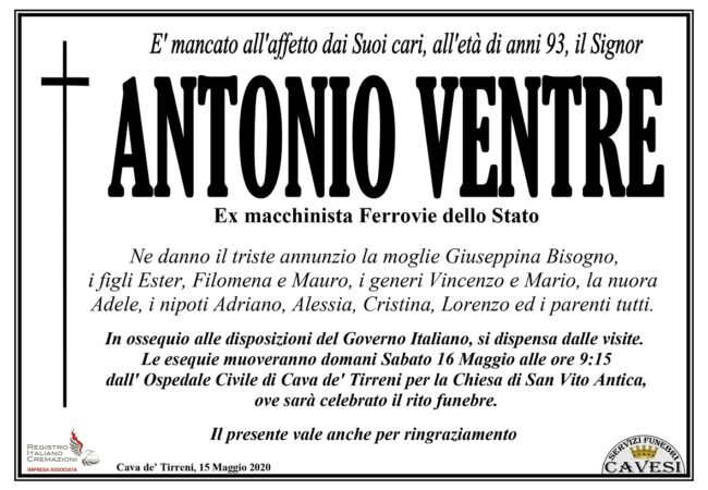 E’ mancato all’affetto dei suoi cari, all’età di 93 anni, il signor Antonio Ventre, ex macchinista delle Ferrovie dello Stato.