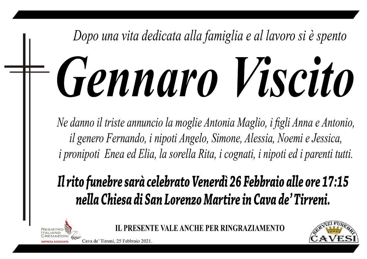 Il rito funebre sarà celebrato oggi pomeriggio, venerdì 26 febbraio, alle ore 17,15, nella Chiesa di San Lorenzo Martire in Cava de’ Tirreni.
