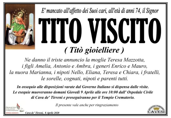 E’ mancato all’affetto dei suoi cari, all’età di 74 anni, il signor Tito Viscito (Titò gioielliere).