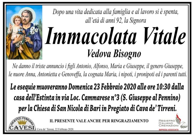 Le esequie muoveranno domani, domenica 23 febbraio, alle ore 10,30 dalla casa dell’Estinta in via Loc. Cammarese n. 3 (S. Giuseppe al Pennino) per la Chiesa di San Nicola di Bari in Pregiato di Cava de’ Tirreni.