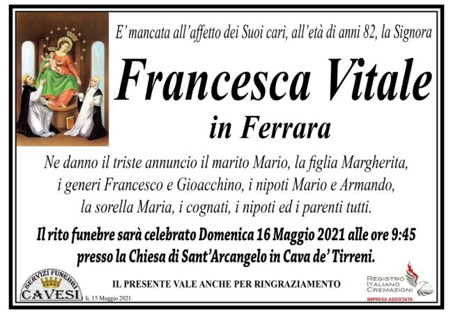 E’ mancata all’affetto dei Suoi cari, all’età di anni 82, la Signora Francesca Vitale in Ferrara.