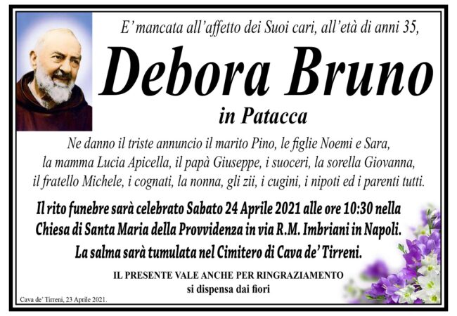 E’ mancata all’affetto dei Suoi cari, all’età di anni 35, Debora Bruno in Patacca.