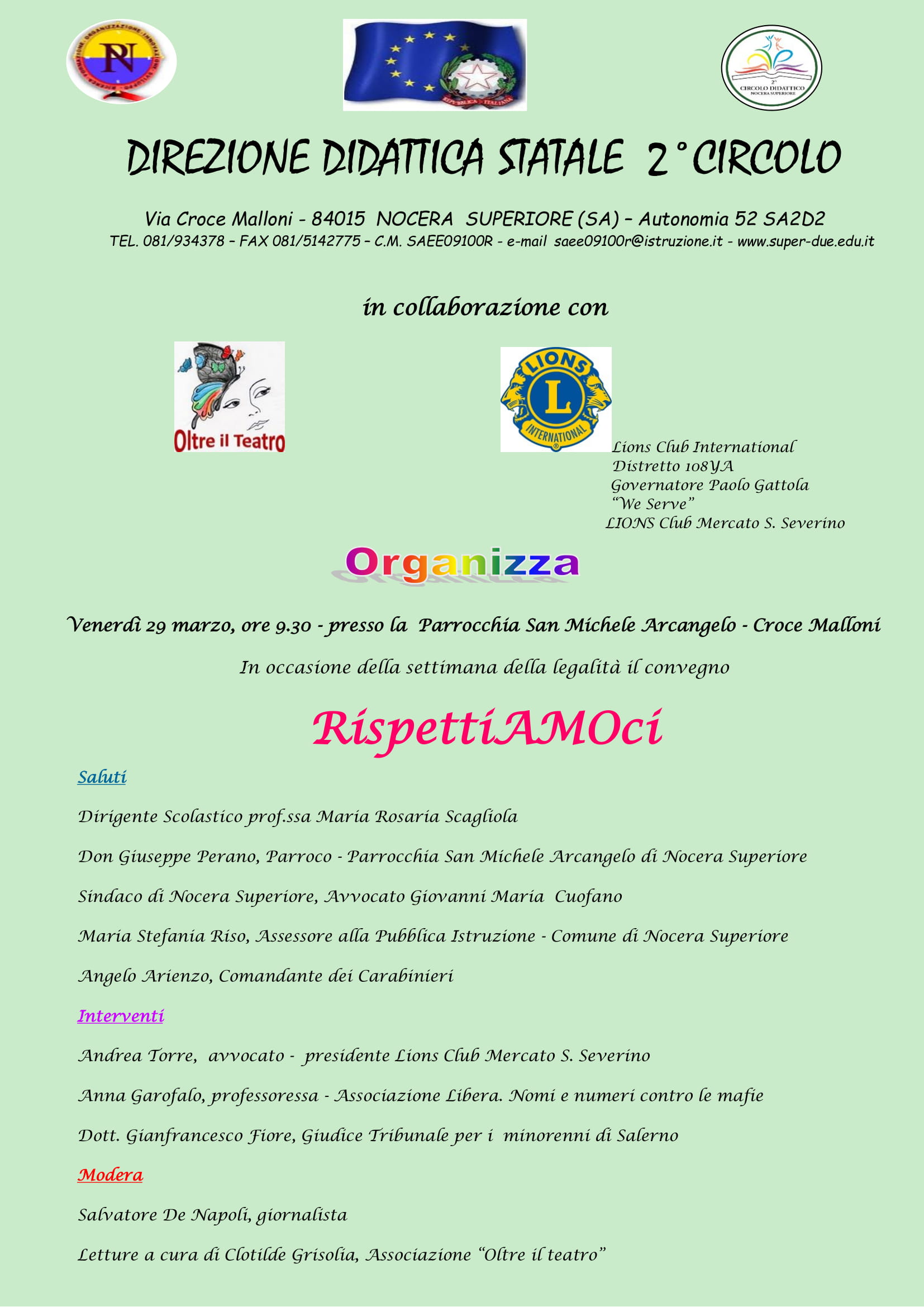 Il convegno organizzato dal 2° Circolo didattico di Nocera Superiore, in collaborazione con Oltre il Teatro e Lions Club International Distretto 108YA Governatore Paolo Gattola “We Serve” LIONS Club Mercato S. Severino, vedrà la partecipazione di numerosi esponenti del mondo scolastico e della società civile. Si comincerà con i saluti della dirigente scolastica, Maria Rosaria Scagliola, di don Giuseppe Perano, parroco della Parrocchia San Michele Arcangelo di Nocera Superiore, del sindaco di Nocera Superiore, Giovanni Maria Cuofano, di Maria Stefania Riso, assessore alla Pubblica Istruzione, di Angelo Arienzo dell’Arma dei Carabinieri.