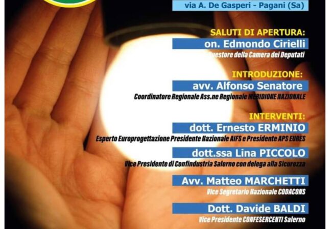 Sono previsti interventi del dott. Ernesto Erminio, Esperto Europrogettazione, Presidente Nazionale AIFS ed APS Eures, della dott.ssa Lina Piccolo, Vicepresidente di Confindustria Salerno con delega alla sicurezza, dell’avv. Matteo Marchetti, Vice Segretario Nazionale Codacons, del dott. Davide Baldi Vice Presidente Confesercenti Salerno e del dott. Franco Risi, Presidente Confartigianato Salerno.