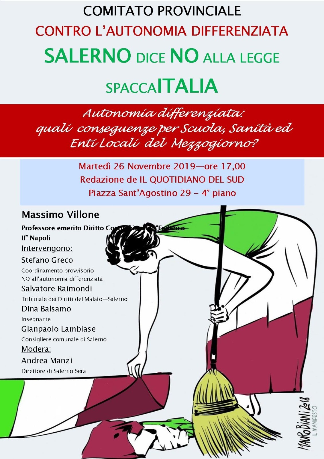Secondo gli organizzatori l rischio è che questa forma di autonomia avrà un impatto devastante sulle Regioni del Mezzogiorno, che già oggi soffrono per i mancati investimenti dello Stato, soprattutto riguardo alle infrastrutture e alla spesa storica per la sanità: per essi l’Italia è un’unica identità statale e tale deve rimanere.