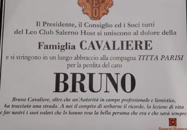 Commosso il ricordo dei Lions salernitani: “La Presidenza, il Consiglio ed i soci del Club si uniscono al dolore della famiglia e si stringono in un lungo abbraccio alla moglie. Bruno Cavaliere, oltre che una vera autorità in campo professionale e lionistico, ha tracciato una strada per tutti noi. A noi il compito di serbarne il ricordo, la lezione di vita e far nostri i suoi valori che lo hanno reso la bella persona che era e che sarà sempre. Dio lo abbia in Gloria”.