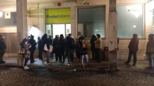 E qui sotto pubblichiamo la foto scattata poco fa, prima delle 19, della fila comunque consistente nonostante l’ora tarda ormai in prossimità della chiusura dell’Ufficio Postale.