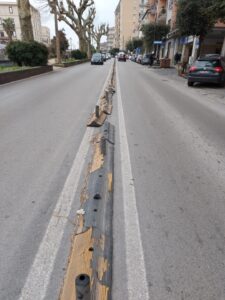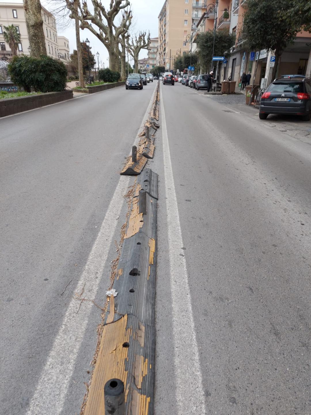 Puntano il dito anche sul famoso “cordolo della discordia” che tante polemiche e stizza provocò da parte degli abitanti della zona, dei commercianti e degli utenti della strada al momento della sua installazione che fu vista e mal digerita come una vera e propria imposizione: “Alcuni pezzi di cordolo sono completamente distaccati e posizionati in senso orizzontale sulla strada, creando un pericolo per i veicoli a due ruote che circolano. Ma nessuno vede e fa nulla”.