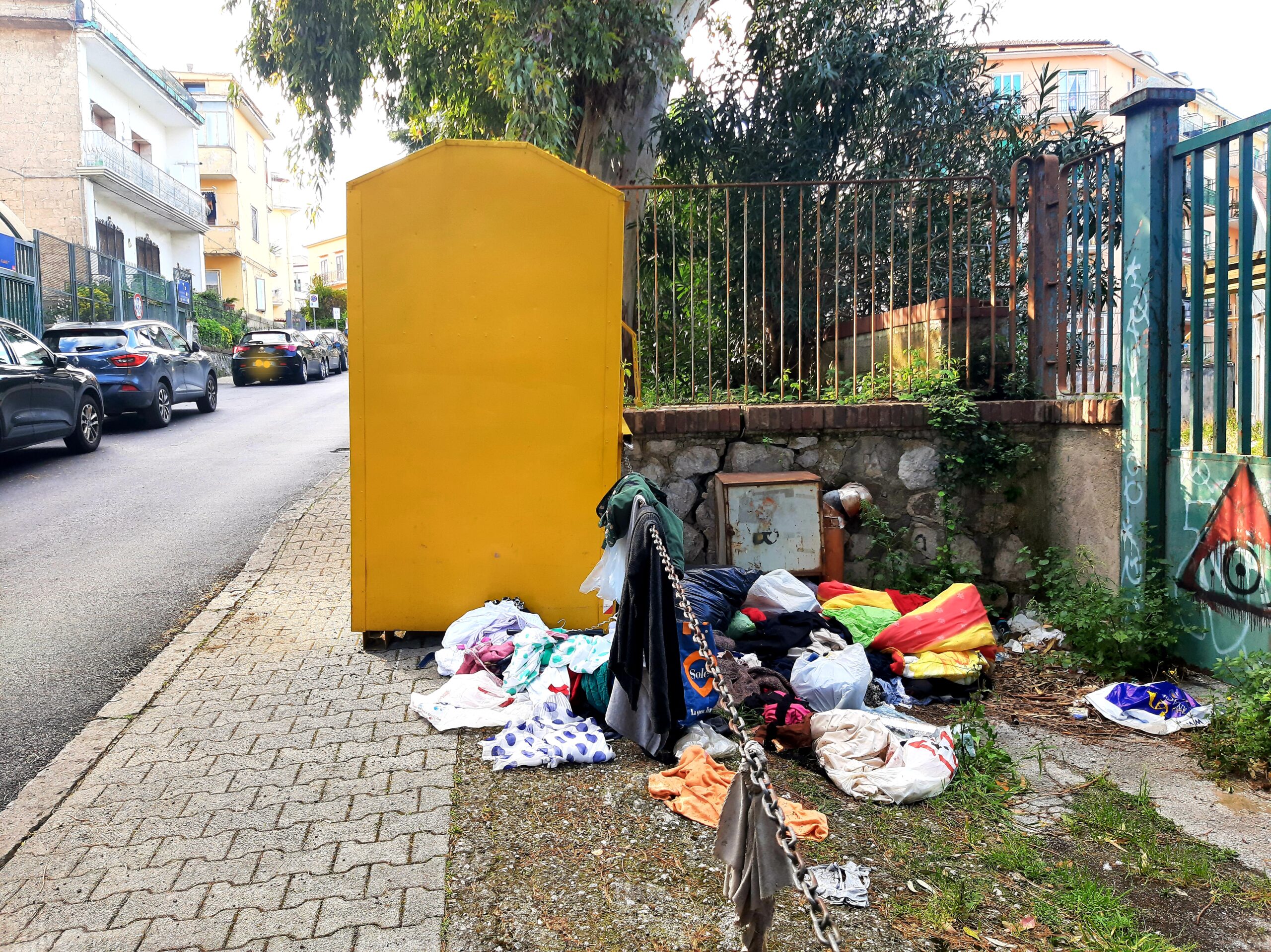 Cumuli di vestiti e scarpe sparpagliati e abbandonati fuori dai cassonetti di raccolta degli abiti usati, sul marciapiede di via Rosario Senatore . Il degrado sul ciglio della strada ci è stato segnalato da diversi residenti e passanti.