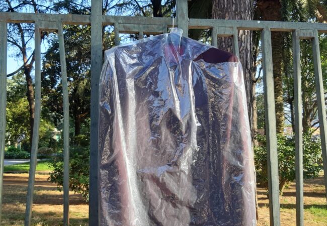 Una giacca, probabilmente fresca di lavaggio in lavanderia, abbandonata con tanto di gruccia e cellophane vicino alla ringhiera della villa comunale Schewerte, lungo via Tafuri.