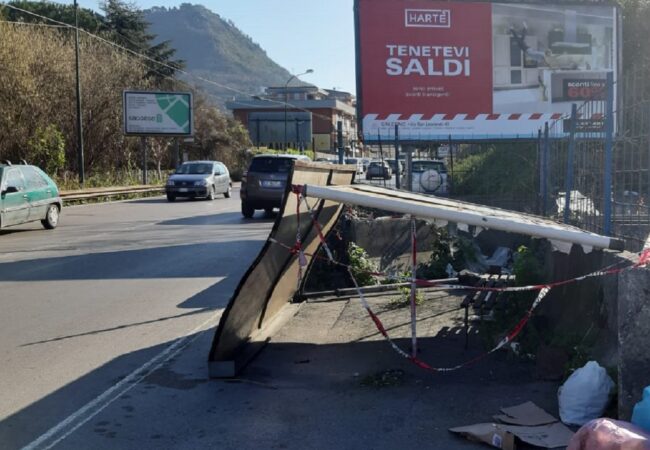 E’ venuta giù da una settimana, forse per le forti raffiche di vento dei giorni scorsi, ma la pensilina resta ancora lì, in attesa che chi di dovere decida cosa fare e se fare qualcosa.