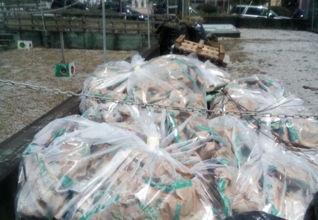 Sacchi neri che contengono lo sfalcio dell’erba e altri sacchi trasparenti riempiti a loro volta di buste di carta dal contenuto non meglio identificato.
