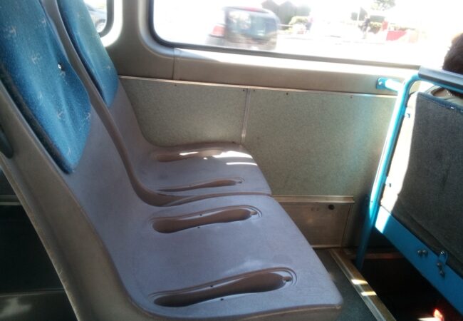 Il bus, infatti, ha solo la spalliera ancora rivestita dall’imbottitura. Mentre la seduta è praticamente ridotta ad un duro pezzo di plastica con due grandi fessure dove evidentemente era incastrata la copertura, privo di rivestimento.