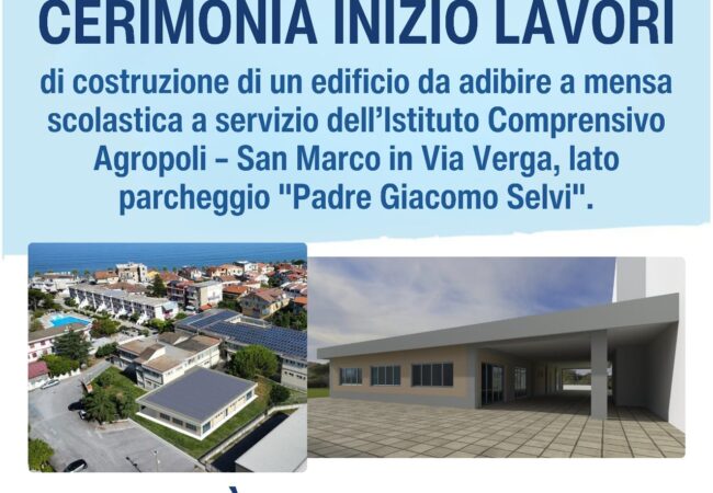 Sarà inaugurato martedì 18 novembre, alle ore 10 presso il parcheggio “Padre Giacomo Selvi”, il cantiere per la costruzione della nuova mensa scolastica dell’Istituto Comprensivo “Agropoli – San Marco”. L’intervento, finanziato con fondi PNRR per un importo di 804.000 euro, rientra nel piano nazionale per l’estensione del tempo pieno e il potenziamento dei servizi scolastici.